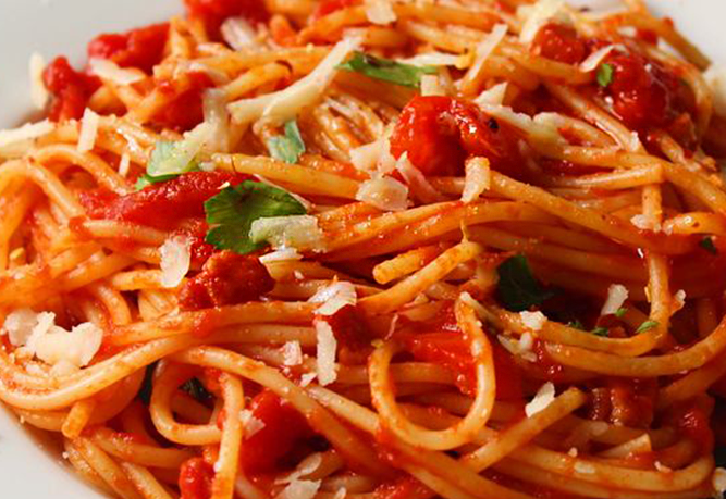 2、拌入意大利肉酱150g,撒上欧芹碎2g、黑胡椒碎1g、蒜香油3g;